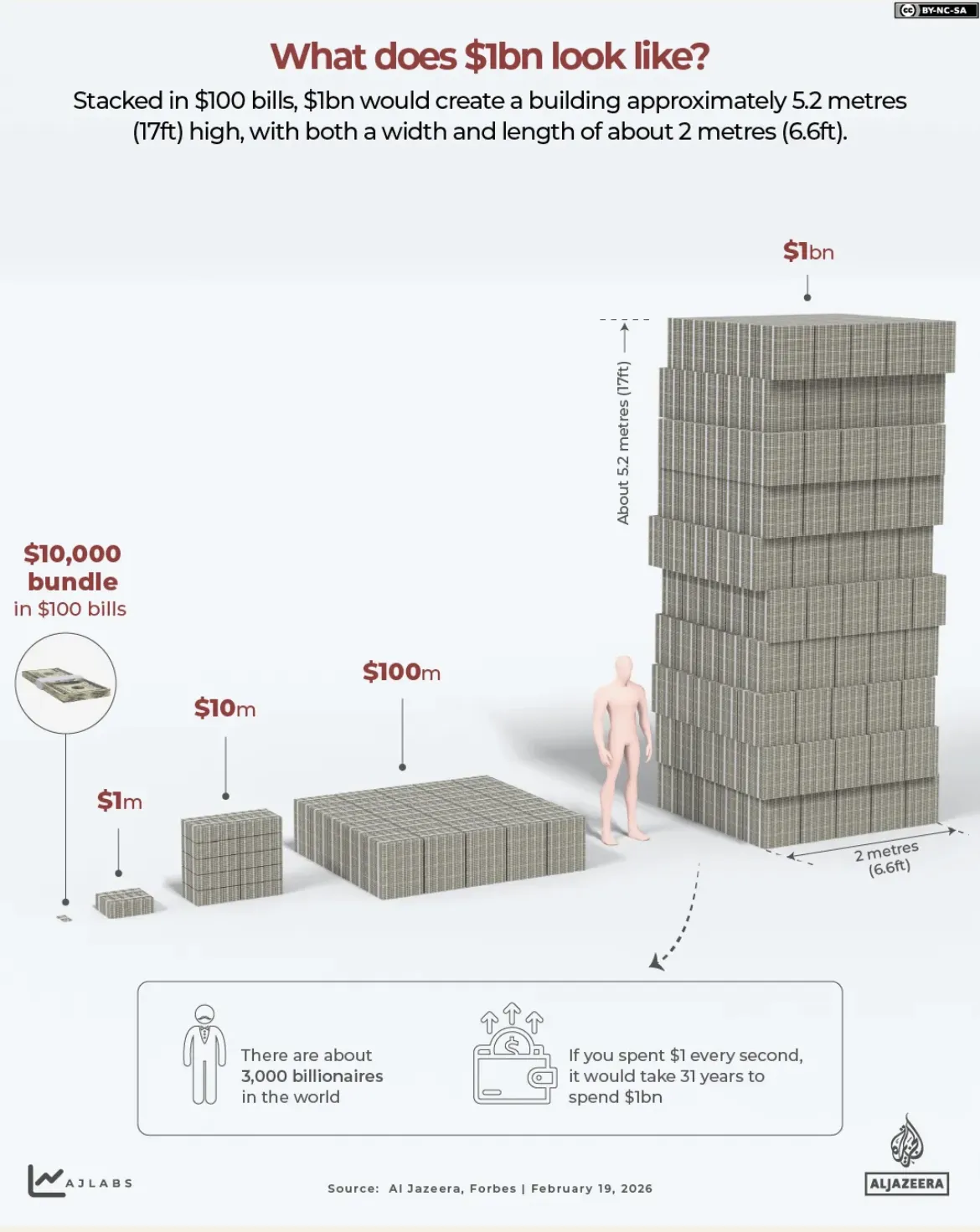 $1 billion in $100 bills stacks into a building 5.2 meters (17 feet) tall, 2 meters (6.6 feet) wide, 2 meters deep (6.6 feet). That's a solid block of cash—about the height of a giraffe and roughly the width of a parking space. A person standing next to it reaches barely a third of the way up. Now imagine a thousand of those blocks. That's what $1 trillion looks like.