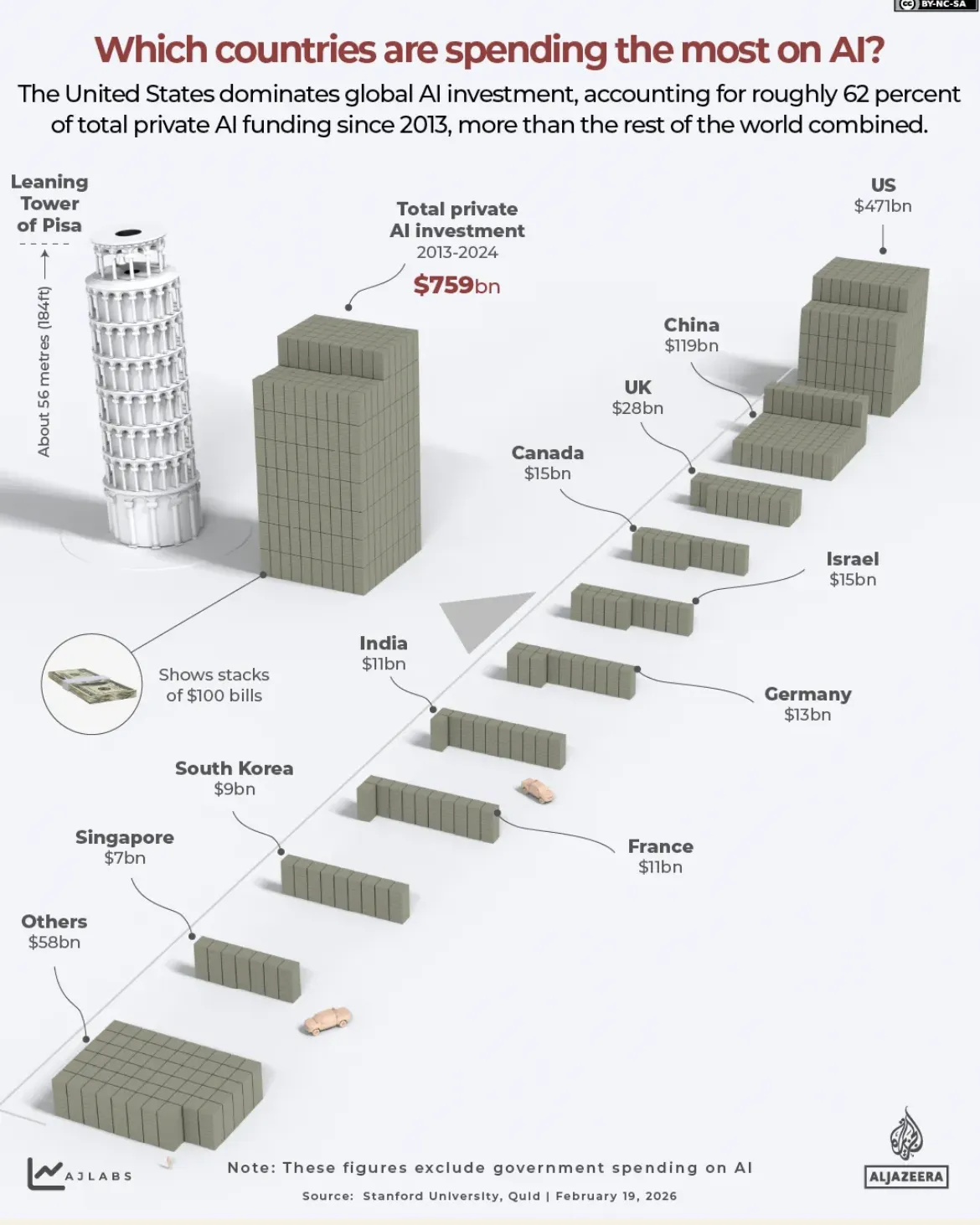 The spending isn't evenly distributed. Across the top ten investing countries, $759 billion in private AI funding was deployed between 2013 and 2024. The US accounts for 62% of that ($471 billion). China is second at $119 billion. The UK, a distant third at $28 billion, spent roughly the annual GDP of a small country on a technology that barely existed commercially fifteen years ago. None of these figures include government spending—the CHIPS Act, national AI programs, defense contracts. That's a separate, additional pile. The full global total, when you add in all corporate investment across every country and category, reaches a stunning $1.6 trillion.